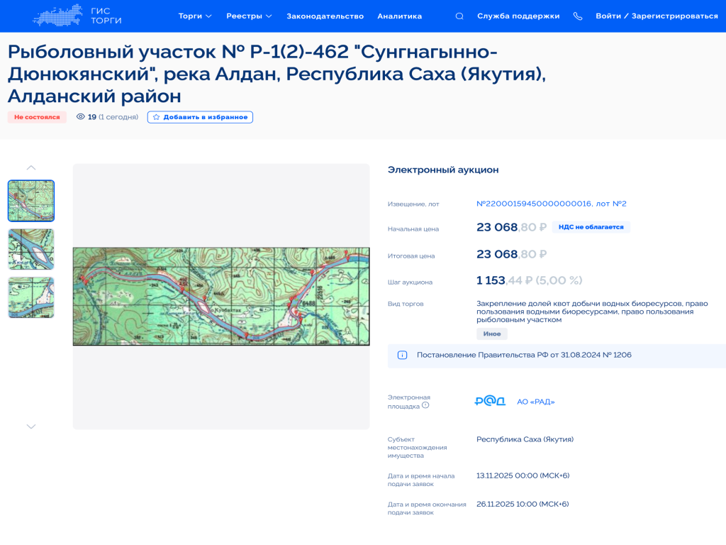 Восточно-Сибирское территориальное управление Росрыболовства подвело итоги электронного аукциона по закреплению трех участков для организации любительского рыболовства в Республике Саха (Якутия). Сбор заявок, начавшийся 13 ноября, завершился 26 ноября, и на каждый из выставлявшихся лотов поступило лишь по одной заявке. В результате торги были признаны несостоявшимися. Договоры пользования водными биоресурсами на двадцать лет будут заключены с единственными претендентами по стартовой цене каждого лота.
