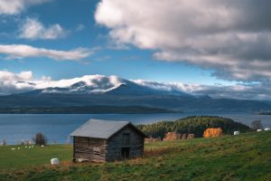Wooden cabin on a beautiful field next to a calm lake during daylight