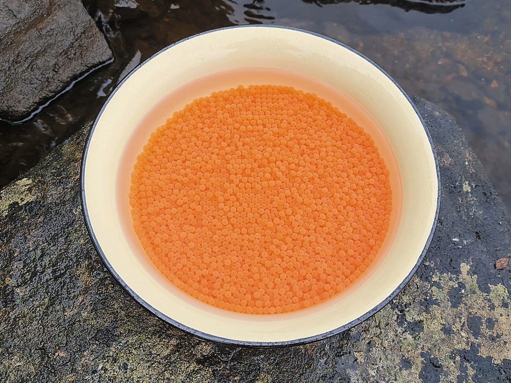 Т.е. вначале в контейнер помещали слой инкубационного субстрата, первый из трех. Затем мерным стаканчиком высыпали икру лосося в количестве 1000 икринок и распределяли ее по мерной пластине силиконовой кистью. И так послойно, три раза.
