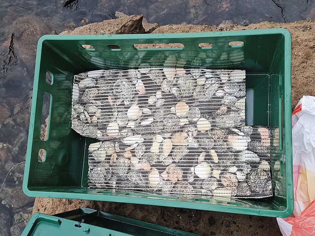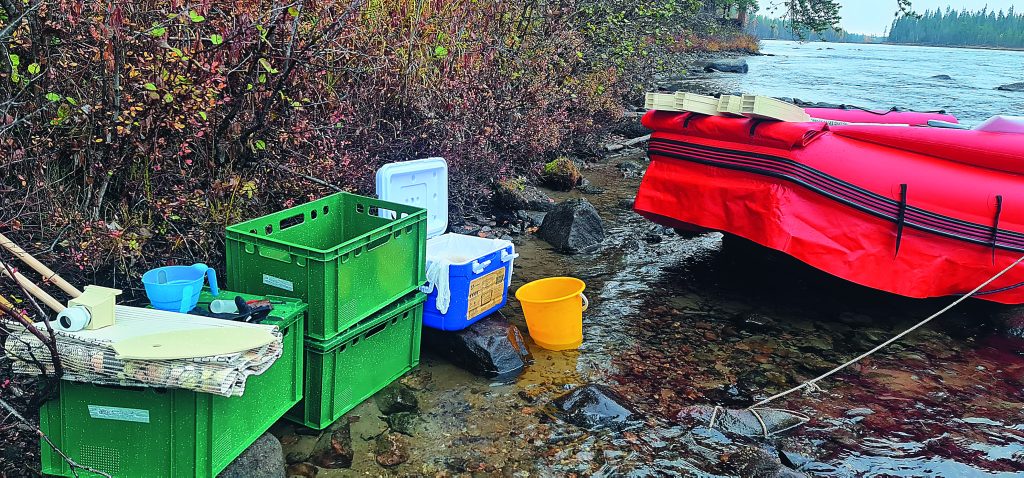 Место установки гнезд-инкубаторов, как вы уже знаете из предыдущего номера, было выбрано заранее в ходе первого этапа экспедиции 2022 года. На выбранном для осуществления проекта пороге, в соответствии с нашими расчётами, можно разместить до 63000 особей разновозрастной молоди семги. На этом участке плотность распределения пестряток относительно низкая, и мы поставили задачу в ходе последующих четырех лет ежегодных выпусков довести эту численность до плотности 180 экз./100 м², что приблизительно соответствует природным показателям диких популяций. Таким образом, в рамках этого охраняемого модельного участка мы сможем проследить взаимоотношения молоди со столь высокой плотностью, оценить скорость роста молоди, а также ее «отход» и коэффициент возврата производителей на порог.
